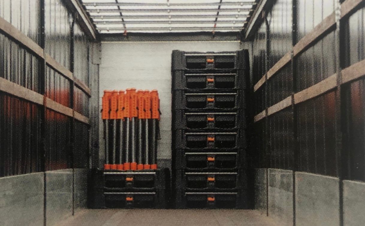 Im LKW abladen, dann für andere Rückfracht Platz. Gegen Pfand beim Kunden lassen.